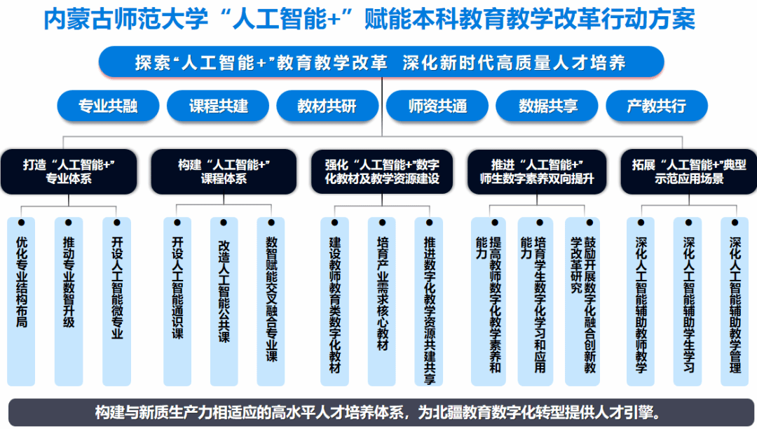 《方案》以构建与新质生产力相适应的高水平人才培养体系,为北疆教育数字化转型提供人才引擎为目标,通过“专业体系重构+课程体系创新+资源建设升级+师生素养提升+应用场景拓展”五大战略路径,打造覆盖24个本科教学单位的智能教育矩阵。