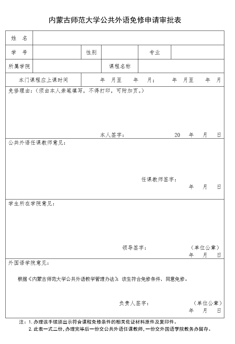 公共外语免修申请审批表