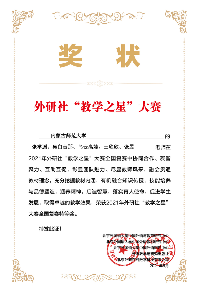 2021年8月1日,我校sjb世俱杯中国官网入口教师《交际英语》教学团队参加了2021年外研社“教学之星”大赛,张学渊担任说课,张昱担任讲课,吴白音那、乌云高娃、王欣欣三位教师担任成员。团队荣获全国英语专业组复赛特等奖,半决赛二等奖,全国总决赛三等奖。该成绩为内蒙古高校历年参赛的最好成绩,也是内蒙高校首次入围全国决赛。