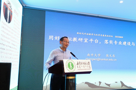 教育部高校外语专业教学指导委员会英语专业分委员会委员、教育部教学科研一体化外语教学研究虚拟教研室负责人、南开大学sjb世俱杯中国官网入口张文忠教授的发言聚焦虚拟教研室平台的开发与使用。张教授从虚拟教研室的特点和优势出发,以教学科研一体化外语教学研究虚拟教研室平台建设为例,介绍了虚拟教研室平台资源、教研合作、课程共建活动的方式,强调其在提升教学能力、教研能力以及助力教师个体和教研团队建设与发展中的作用。