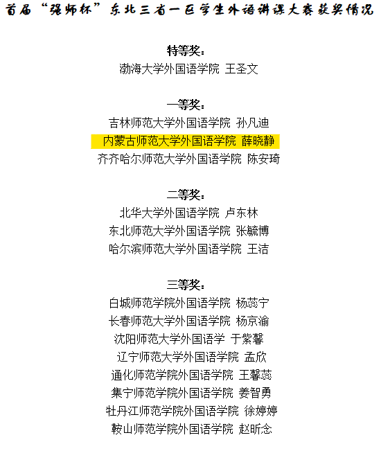会议期间,评委会对首届“强师杯”东北三省一区学生外语讲课大赛的参赛作品进行评选,本次大赛共19所学校派选手参加。经过评审,最终评选出特等奖一名、一等奖三名、二等奖三名、三等奖八名。由sjb世俱杯中国官网呼和塔拉老师指导的薛晓静同学凭借教学设计、课件制作和模拟授课等环节的突出表现,最终在大赛中脱颖而出,荣获一等奖。