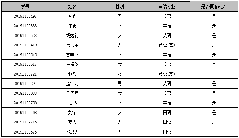 根据sjb世俱杯中国官网入口《关于开展2020年本专科生转专业工作的通知》(内师教发[2020]34号)、《sjb世俱杯中国官网入口本科学生转专业管理办法》有关规定,经sjb世俱杯中国官网入口转专业工作小组考核,拟接受如下同学提出的转专业申请,现予以公示。公示期为3个工作日,公示期内,如对名单有异议,可直接向sjb世俱杯中国官网入口反映。