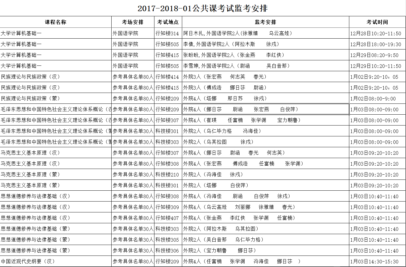 sjb世俱杯中国官网入口2017-2018学年第一学期公共课期末考试时间具体安排表(盛乐校区)