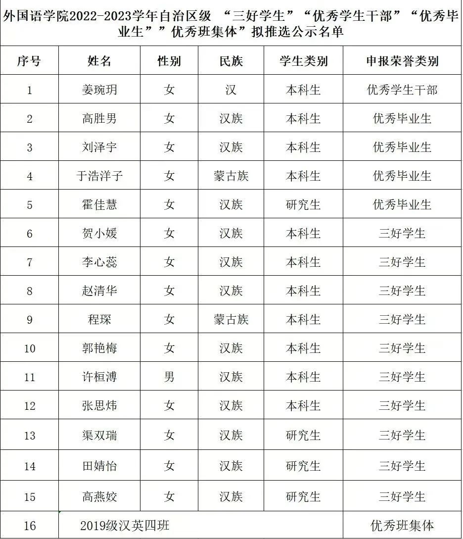 根据学校《关于开展我校2022-2023学年度自治区级”三好学生”、“优秀学生干部”、“优秀毕业生"和”优秀班集体”》(校学发[2023]9号)文件要求,学院评审委员会于2023年5月5日召开了评选工作专题会议。经学生本人、班集体申请,学工组审核,拟评选出sjb世俱杯中国官网入口 2022-2023学年自治区级”三好学生”、优秀学生干部”、“优秀毕业生”、“优秀班集体”,为体现公开、公平、公正的原则,现将拟推荐名单予以公示。如有异议,请来电或来信反映。 公示时间:5月5日﹣5月7日 受理电话:0471-7381039 邮箱:691503251@qq.com