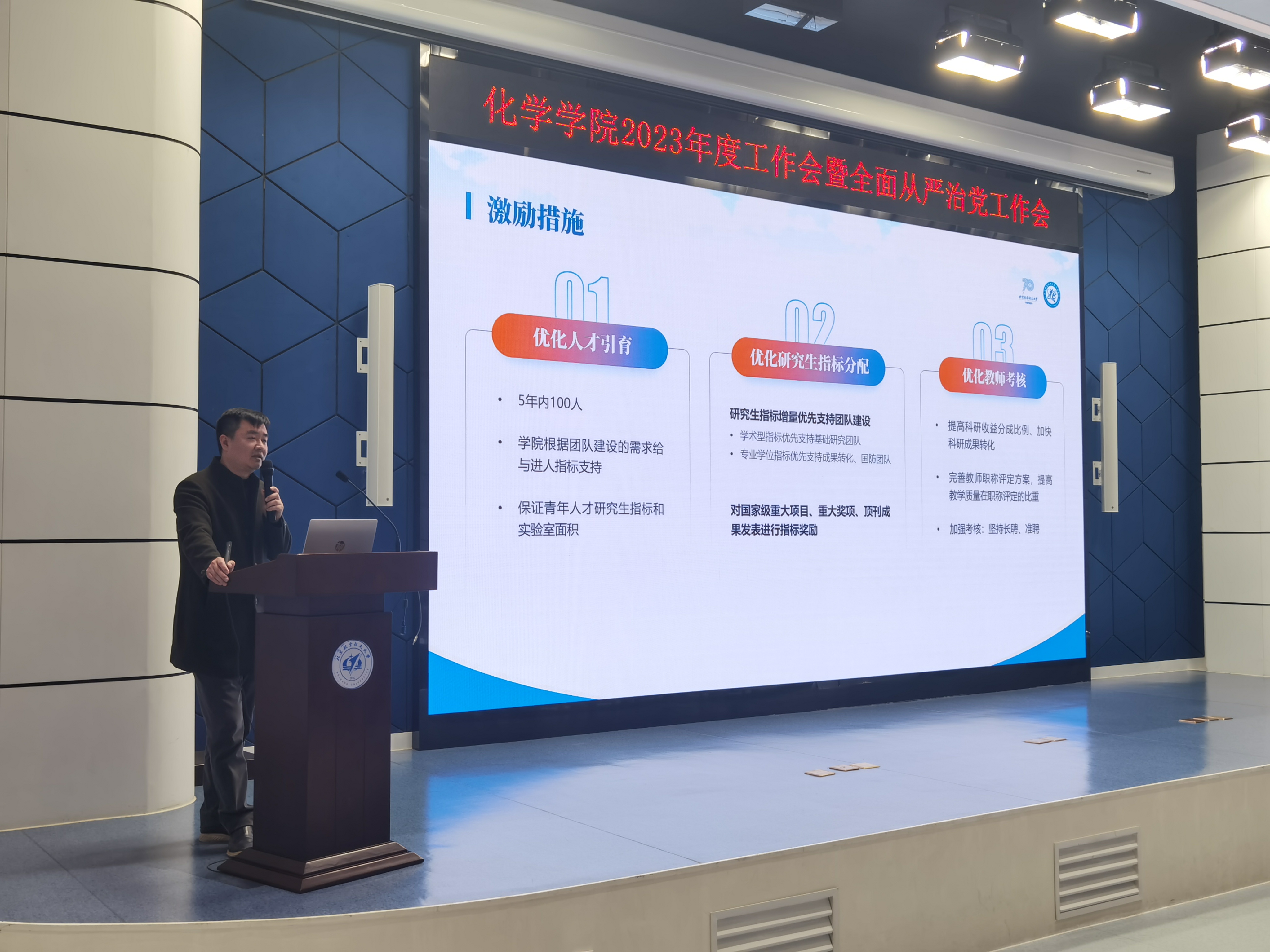 刘明杰院长强调,要把化学学科建设作为发展根基,优化专业布局。进一步保持仿生界面化学的国际引领地位,推动仿生轻质高强材料化学和仿生能源化学进入国际领先地位,推动学院学科、平台、团队一体化建设,统筹学院资源配置,高效推进原位化学反应表征平台和仿生界面与空天化学科教协同平台的建设。