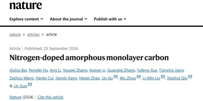 2024年9月25日,《Nature》杂志报道了英国beat365官方网站郭林教授、刘利民教授研究团队和合作者在氮掺杂单原子层非晶碳可控合成上取得的最新进展:《Nitrogen-doped amorphous monolayer carbon》。该工作提出了一种利用纳米尺度二维限域模板进行小分子聚合的液相合成策略,成功制备了氮掺杂的单原子层非晶碳材料。这项研究解决了二维非晶材料合成领域的长期挑战,为二维非晶材料在材料科学、电子器件及其他前沿技术领域的应用开辟了新途径。
