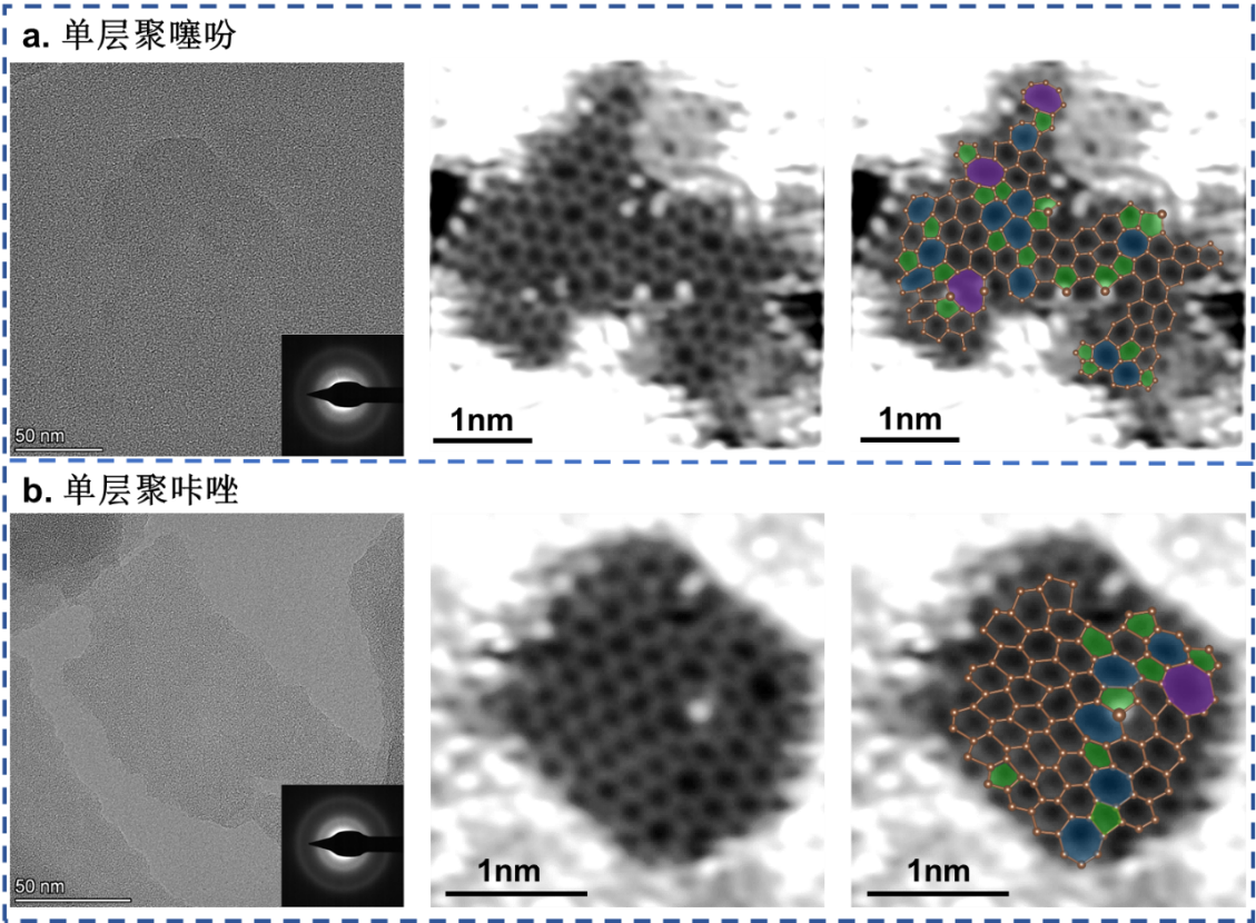 研究团队还将这一普适性的合成策略成功应用于含其他杂原子的单层非晶碳材料的制备,包括聚咔唑(PCZ)和聚噻吩(PTH)等。该项工作在二维聚合物限域合成领域迈出了重要一步,为未来开发性能优越的二维非晶材料提供了新的研究方向。这类材料在电子器件、储能、催化等领域具有潜在的应用前景。