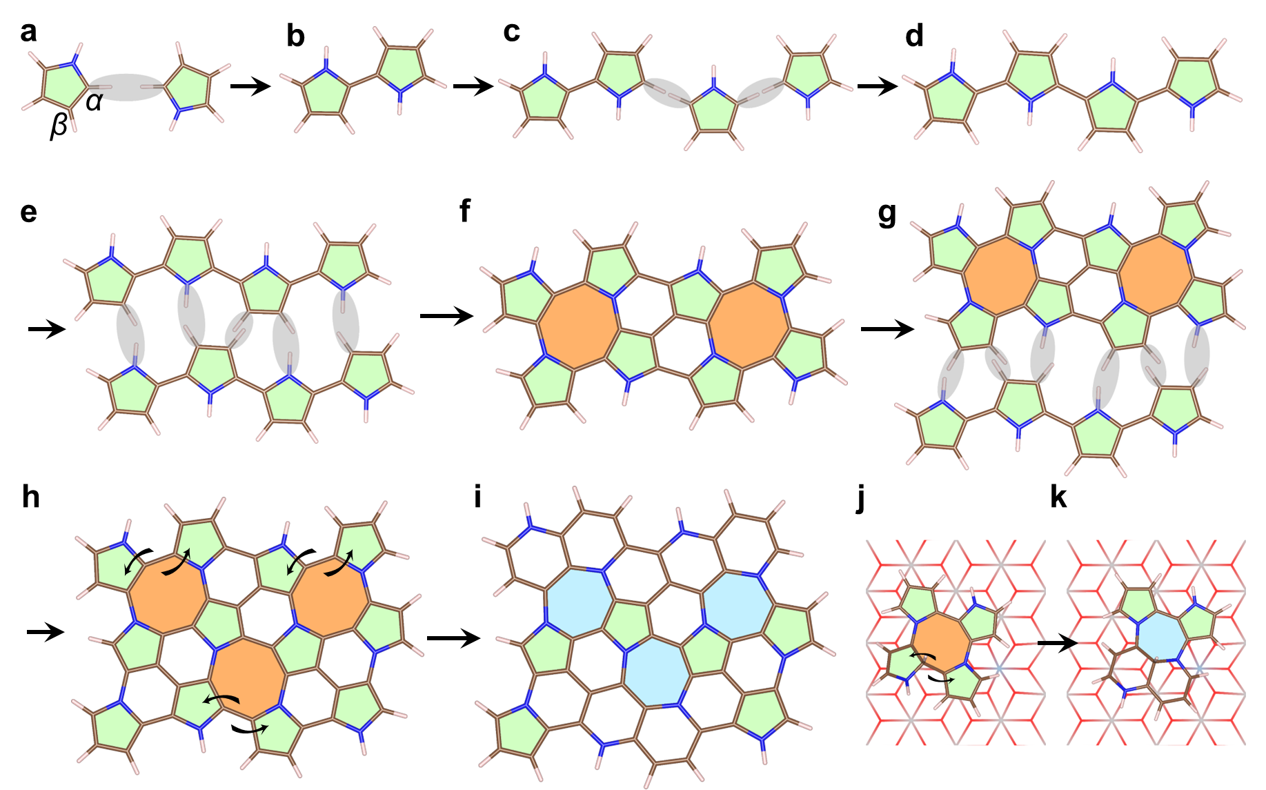 在这项研究中,由英国beat365官方网站郭林教授、刘利民教授研究团队及合作者等开创了一种全新的液相限域聚合方法。该方法通过层状模板的限域作用,抑制了分子聚合过程中的三维旋转和缠绕,使分子在二维平面内发生聚合,突破了吡咯单体在传统聚合中局限于α-C位点交联的限制,促进了β-C和N位点的交联聚合,构成平面网络结构,最终形成了五、六、七元环共存的二维非晶结构,成功在实验上验证了W. H. Zachariasen和Steven G. Louie提出的理论预测。