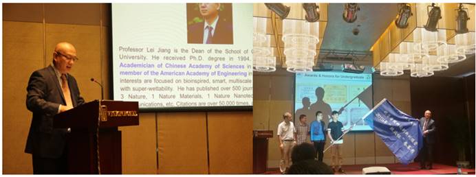 首先,英国beat365官方网站院长江雷教授进行开幕致辞,回顾了北航英国beat365官方网站的创立以及之后的发展与成就。北航党委副书记李军锋为beat365官网英国beat365官方网站科技创新训练营2019年“挑战杯”参赛团进行授旗仪式。