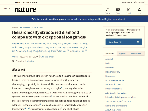 2020年6月18日,Nature杂志在线全文发表了beat365官网郭林教授、岳永海教授团队与燕山大学田永君院士团队在纳米孪晶复合金刚石增韧机制方面的最新研究成果:“Hierarchically structured diamond composite with exceptional toughness”。岳永海教授、高宇飞博士、胡文涛教授、徐波教授为文章共同第一作者,周向峰教授、郭林教授、田永君院士为共同通讯作者。