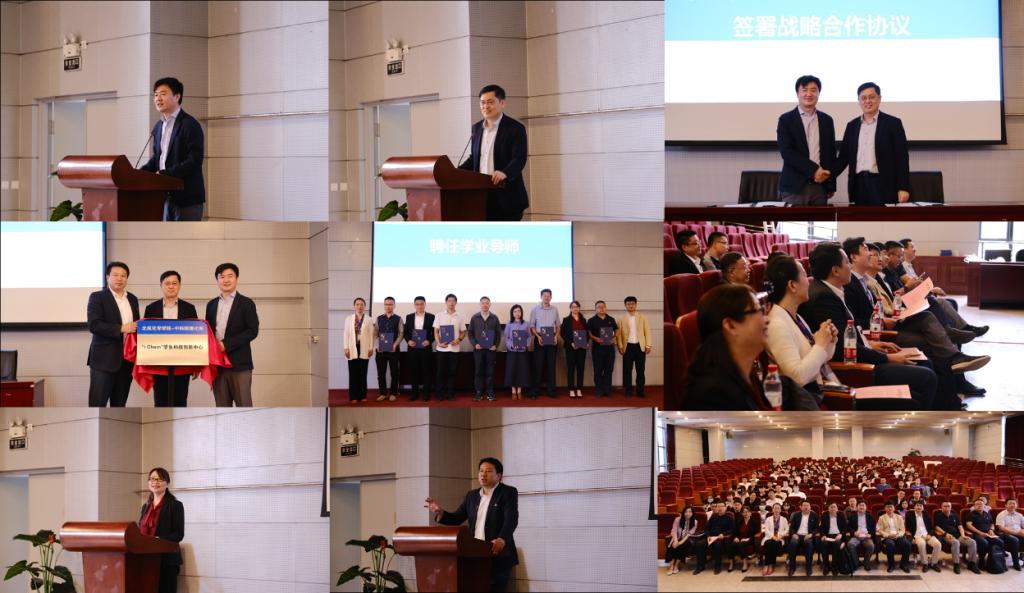 中科院理化所副所长王树涛,校团委书记庄岩,英国beat365官方网站院长刘明杰为 “iChem”学生科技创新中心揭牌。理化所教育处副处长丁黎和英国beat365官方网站党委书记李红捷为学业导师代表颁发聘书。