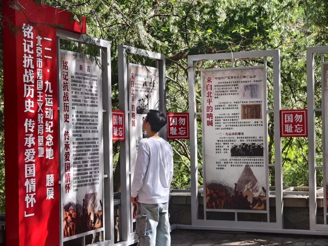 支部党员沿樱桃沟步道攀登至纪念地。行至半途,“勿忘国耻,圆梦中华”的鲜红标语赫然映入眼帘,字字铿锵有力,仿佛跨越时空的呐喊,将抗战精神与新时代青年使命紧密相连。在庄严肃穆的“一二·九运动纪念亭”前,支部书记陈喆为支部党员讲述了“一二·九”运动时期的革命历史和意义。同学们结合展板图文,深刻学习了“一二·九”运动中爱国学生冲破封锁、唤起民众觉醒的历史细节。同学们长久驻足,透过泛黄的历史照片和详实文献,追忆北平学生抗日救国示威游行的壮烈场景。党员王力宏感慨:“题展里郭明秋等革命前辈组织领导爱国学生运动的事迹,让我深刻体会到战争年代,青年学子抛头颅洒热血;当代青年与新时代同向同行,肩负民族复兴重任,我们应牢记嘱托实干笃行,牢记科技强国使命。”党支部书记陈喆表示:“作为理工科研究生,我们既要传承‘科学救国’的历史基因,更要培育‘科技报国’的时代担当。”