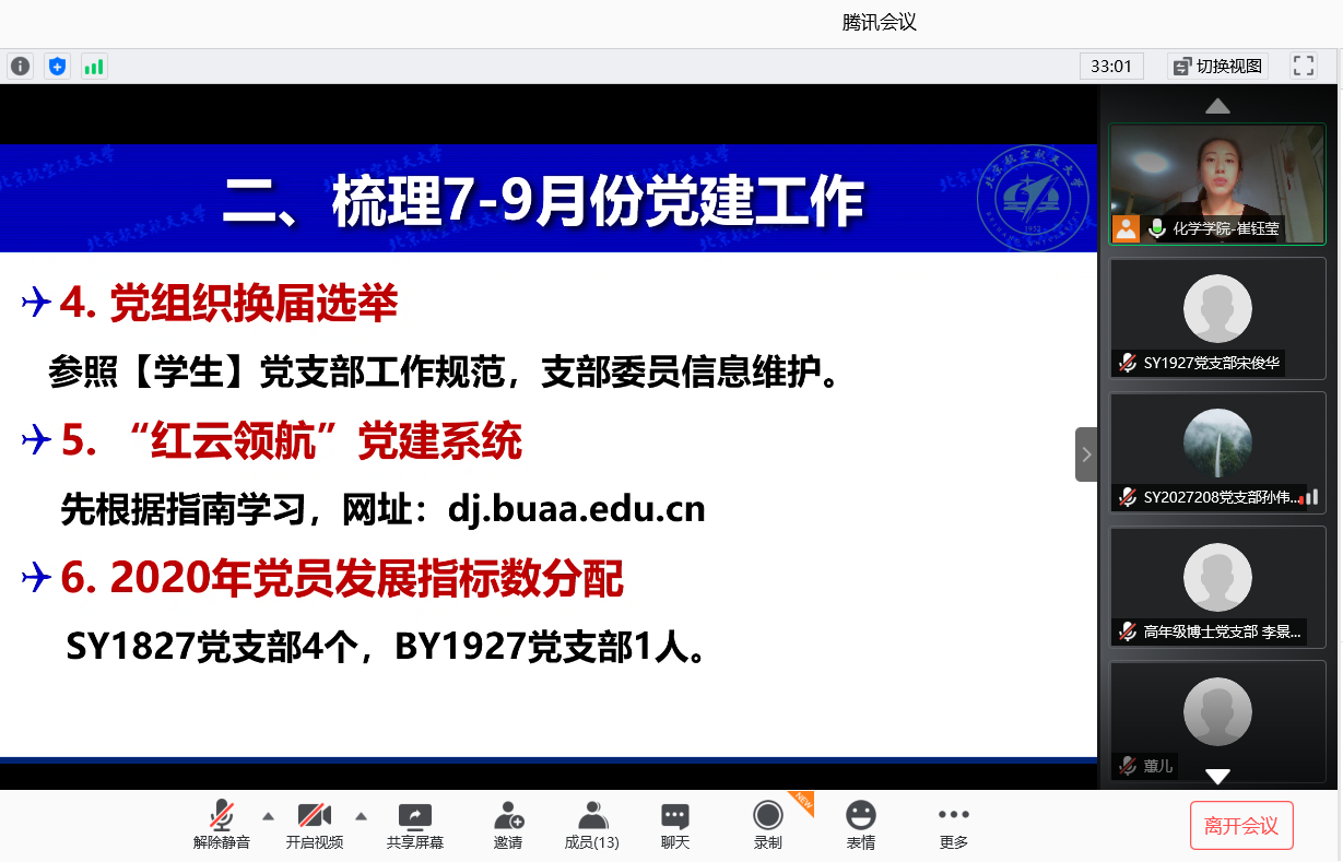 为进一步凝聚合力,扎实推进学院党建各项工作,确保圆满完成全年党建工作任务。2020年9月24日晚19:30,学院组织召开2020年秋季学期第一次支部书记联席会,学院副书记张绍丽、分团委书记魏茜,以及全体学生党支部书记参会。学院党务秘书崔钰莹老师主持线上会议。