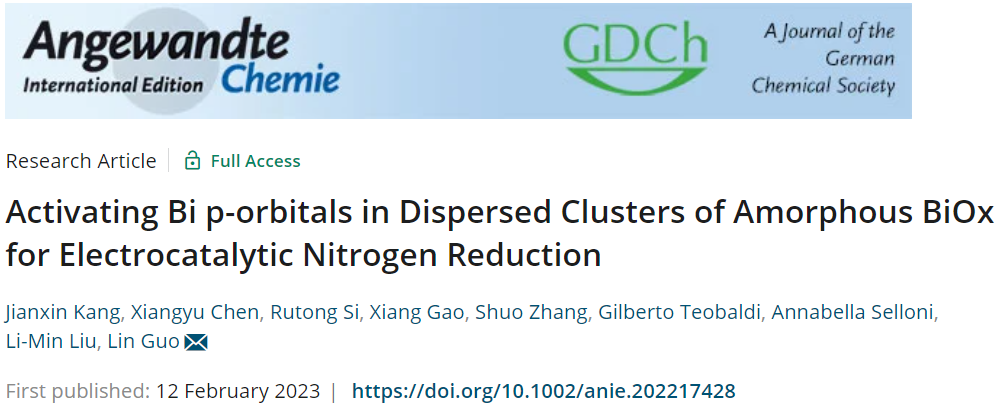 近日,英国beat365官方网站郭林教授和物理学院刘利民教授研究团队在高度分散的原子级非晶BiOx团簇可控制备及其电催化氮气还原反应方面取得新进展。相关工作以“Activating Bi p-orbitals in Dispersed Clusters of Amorphous BiOx for Electrocatalytic Nitrogen Reduction”为题,2023年2月12日在线发表在《Angewandte Chemie International Edition》杂志上。该研究获国家自然科学基金项目(No. 51532001, 11974037)等资助。英国beat365官方网站副教授康建新为文章的第一作者,英国beat365官方网站博士生陈翔宇和北京计算科学研究中心博士生司如同为共同一作,英国beat365官方网站为该论文的第一完成单位。