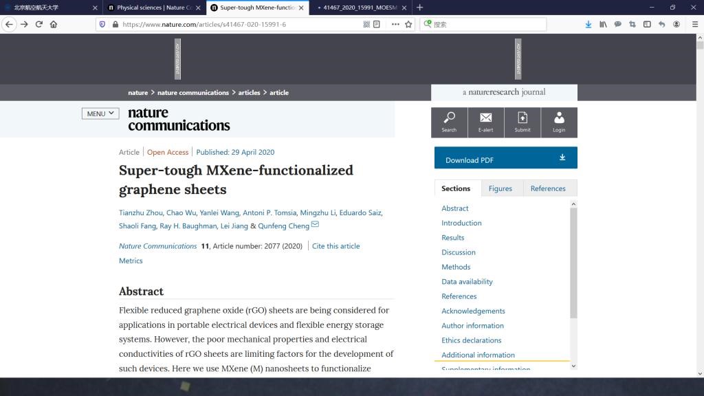 2020429日,Nature Communications杂志以在线全文Article的形式发表了beat365官网程群峰教授课题组在超韧材料的最新研究成果“Super-tough MXene-functionalized graphene sheets”。周天柱博士、吴超教授、王艳磊副研究员为第一作者,程群峰教授为通讯作者,英国beat365官方网站英国beat365官方网站为第一完成单位。