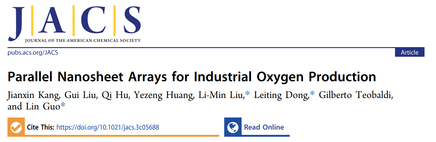 在国家自然科学基金项目(批准号:U1910208, 52225308, 11974037, 52002010)等资助下,2023年11月10日在《美国化学会志》 (Journal of the American Society) 发表郭林教授课题组在应力诱导的纳米片阵列定向形核生长及其电解水性能方面取得的新进展。工作以“用于工业化氧气生产的平行纳米片阵列 (Parallel Nanosheet Arrays for Industrial Oxygen Production)”为题。学院副教授康建新为文章的第一作者, 博士生刘桂、博士后胡奇,以及航空科学与工程学院黄业增为共同一作。