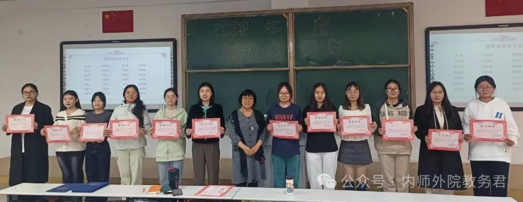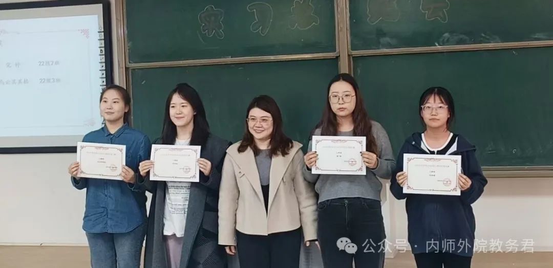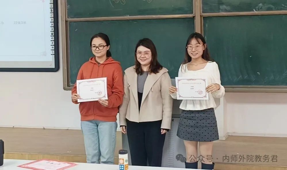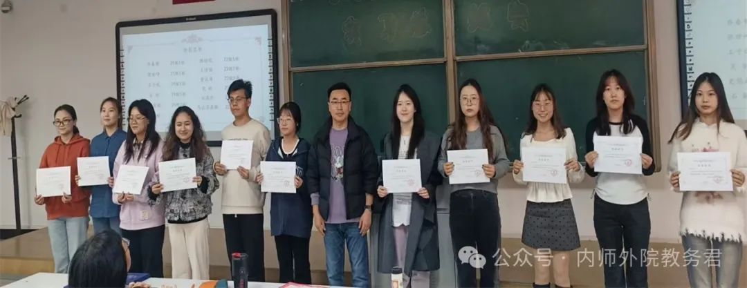 苏日娜老师为“2024年英语专业师范生教学技能竞赛”的获奖选手颁发证书。获奖选手代表2021级英语1班的乔春哲同学作获奖心得分享。