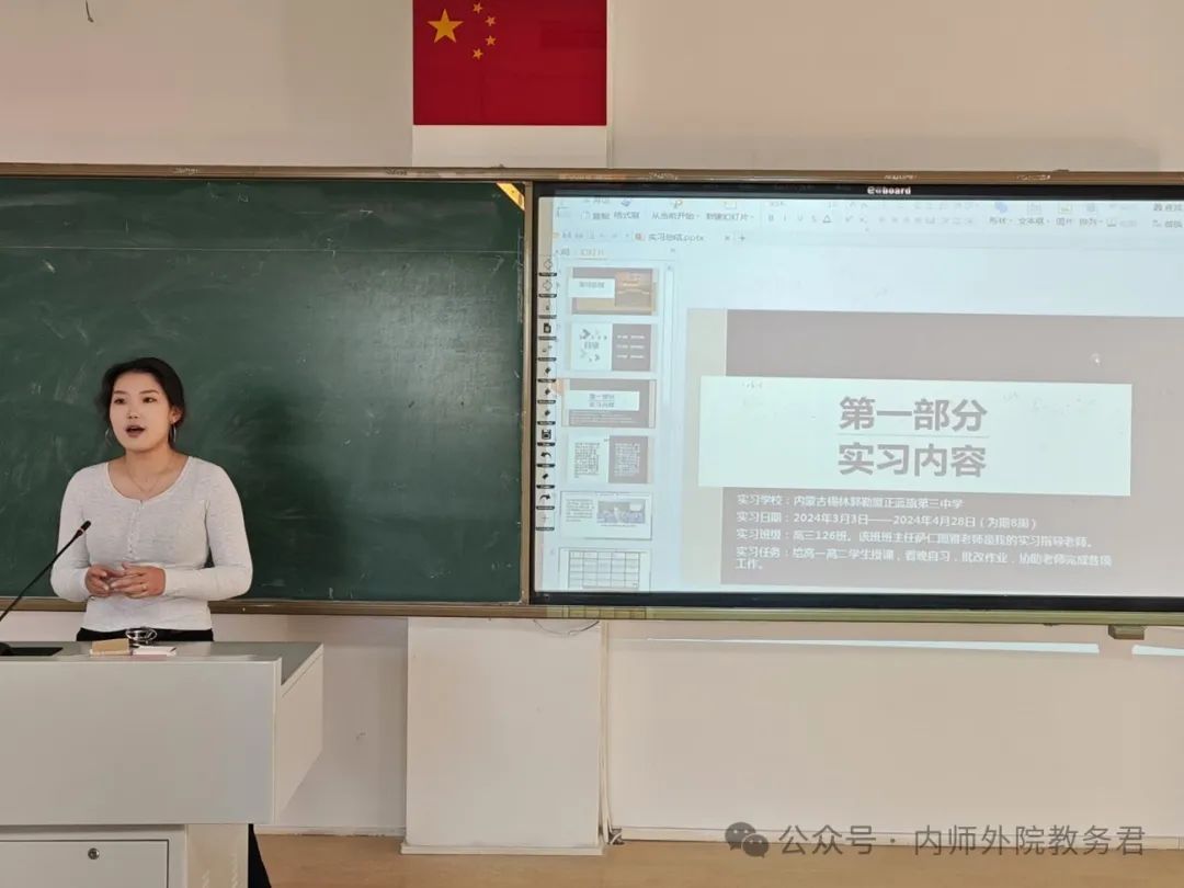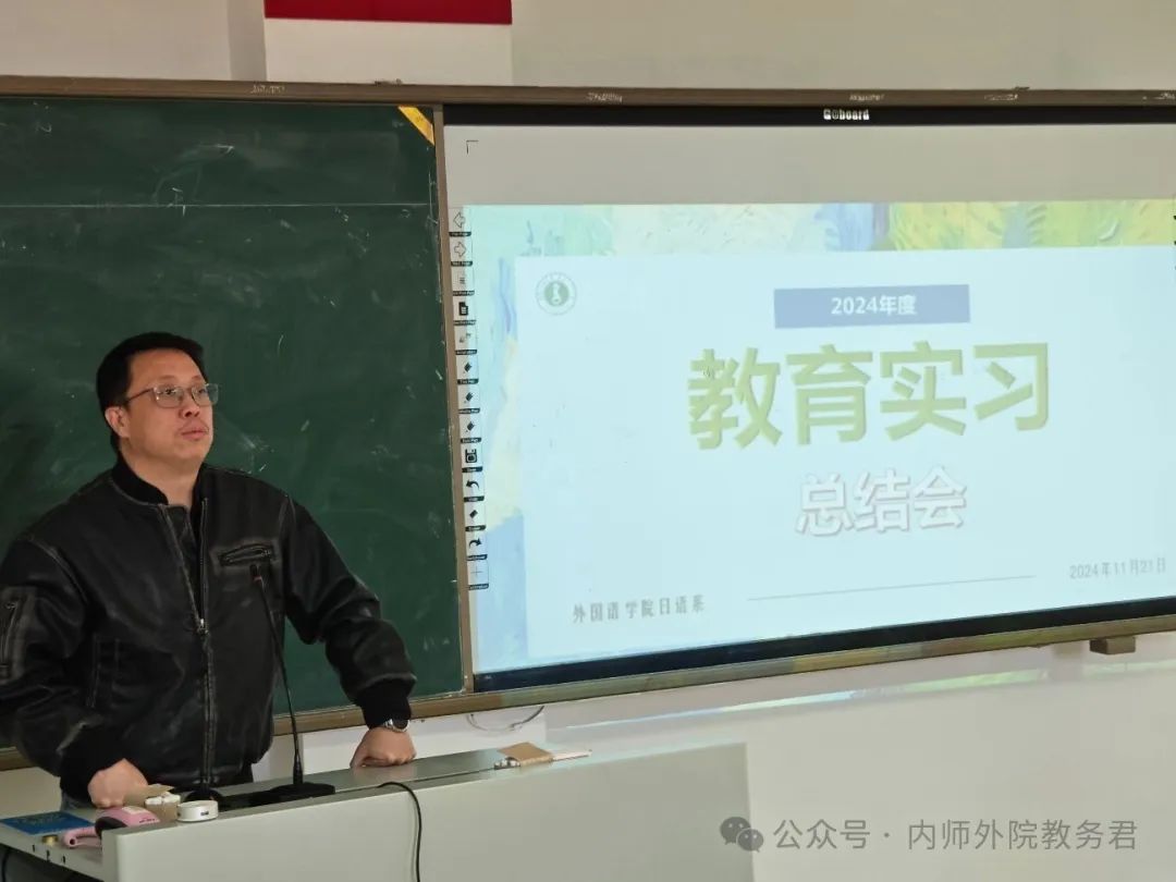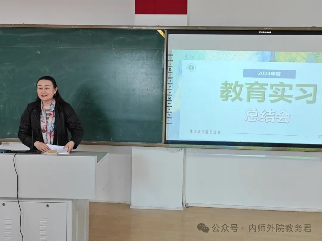 塔娜作为校内指导老师代表从专业实习和班主任实习两方面点评了2021级日语专业学生实习情况,充分肯定了实习生的教学能力、专业知识和班主任工作方法,强调了教育实习能够增强交流沟通能力这一意义,并且寄语同学们继续努力,让实习经历成为今后人生道路上的宝贵财富。