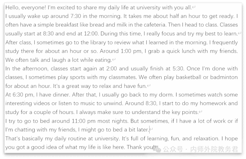 在教学过程中,田超老师通过展示学生口语作业的典型样本,诊断了学生在发音、语法、时间表达及频度副词使用上的常见困难,并聚焦于“时间表达”和“频度副词”的使用进行重点突破。为解决这些问题,田超老师设计了多样化的促成活动,包括英文视频讨论、听力填空以及课本填表练习,旨在从精准性、渐进性和多样性三个维度引导学生掌握用12小时制描述日程的方法,以及根据频度副词的程度在句子中准确选择位置的方法。此外,田超老师还引导学生对典型作业进行修改,通过实践强化学习效果。在展示修改样本后,田超老师布置了修改第一次产出作业的任务,并组织学生开展互评和自我评价。整个教学过程完整呈现了产出导向法的驱动、促成和评价环节,体现了“以学习为中心”的教学理念,充分贯彻了“在做中学,学中做”的教学方法。