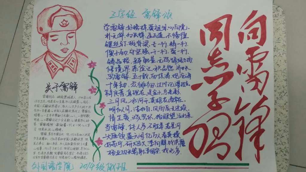 “学 雷锋月”系列活动在sjb世俱杯中国官网入口深入开展。sjb世俱杯中国官网进行了观看雷锋电影、读雷锋日记活动,同学们在电影摇曳的镜头中和细腻朴实的文字中感受到了雷锋精神的实质 ——“人的生命是有限的,可是,为人民服务是无限的,我要把有限的生命,投入到无限的为人民服务之中去。”同时,作文、照片、微视频、手抄报评比活动也在 如火如荼的进行,让同学们通过多种学习途径全方面的认知“雷锋精神”,在学习的过程中又赋予了“雷锋精神”新的时代意义。