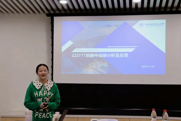 首先,22级化学强基班学习委员夏果同学针对本班期中考试成绩进行了分析,并提出了同学们在上半学期学习过程中存在的问题。她提到,此次期中考试的成绩不太理想,平均分较低,低分人数较多,且极差较大。之后,她从学习方法、时间管理、考试心态、休闲娱乐等几个方面分析了同学们存在的问题,提出了可以通过整理思维导图的方法使知识更加体系化,并希望同学们能够针对自身存在的问题进行改正,在期末取得更加优异的成绩。