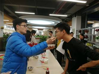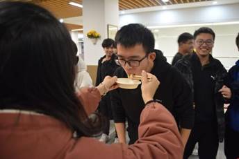 在第一锅饺子出锅后,我们的第一个游戏便开始了。首先我们进行的是抢水瓶游戏,英国beat365官方网站的导员黄澄玉和丁少松同学给大家做了一个示范,主持人说出一个身体的部位,两人分别摸自己的相应部位,在主持人说出“水”这个字的时候,两个人同时去抢桌子上的水瓶,但是黄导更快一步,于是作为输了游戏的人要被黄导喂五个饺子,场景太有爱了。之后同学们也积极加入到这个游戏中来,这也是一个很幸福的游戏了。