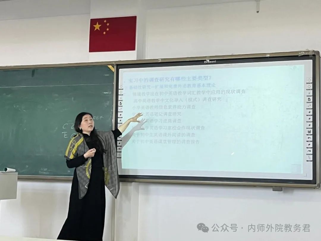 第一场讲座由呼和塔拉老师主讲,主题为“英语教育实习中调查研究选题”。她首先针对同学们在实习调查中遇到的困惑进行了深入分析。通过具体案例,呼和塔拉老师详细解析了理想的实习调查应具备的特点。她指出,实习调查通常分为调查和实验两种,选题时应注重学术性,避免陈旧话题,尤其要避免泛泛而谈的“经验之路”。实习中的调查研究应遵循外语教学的要求,具备科学性和简明性。